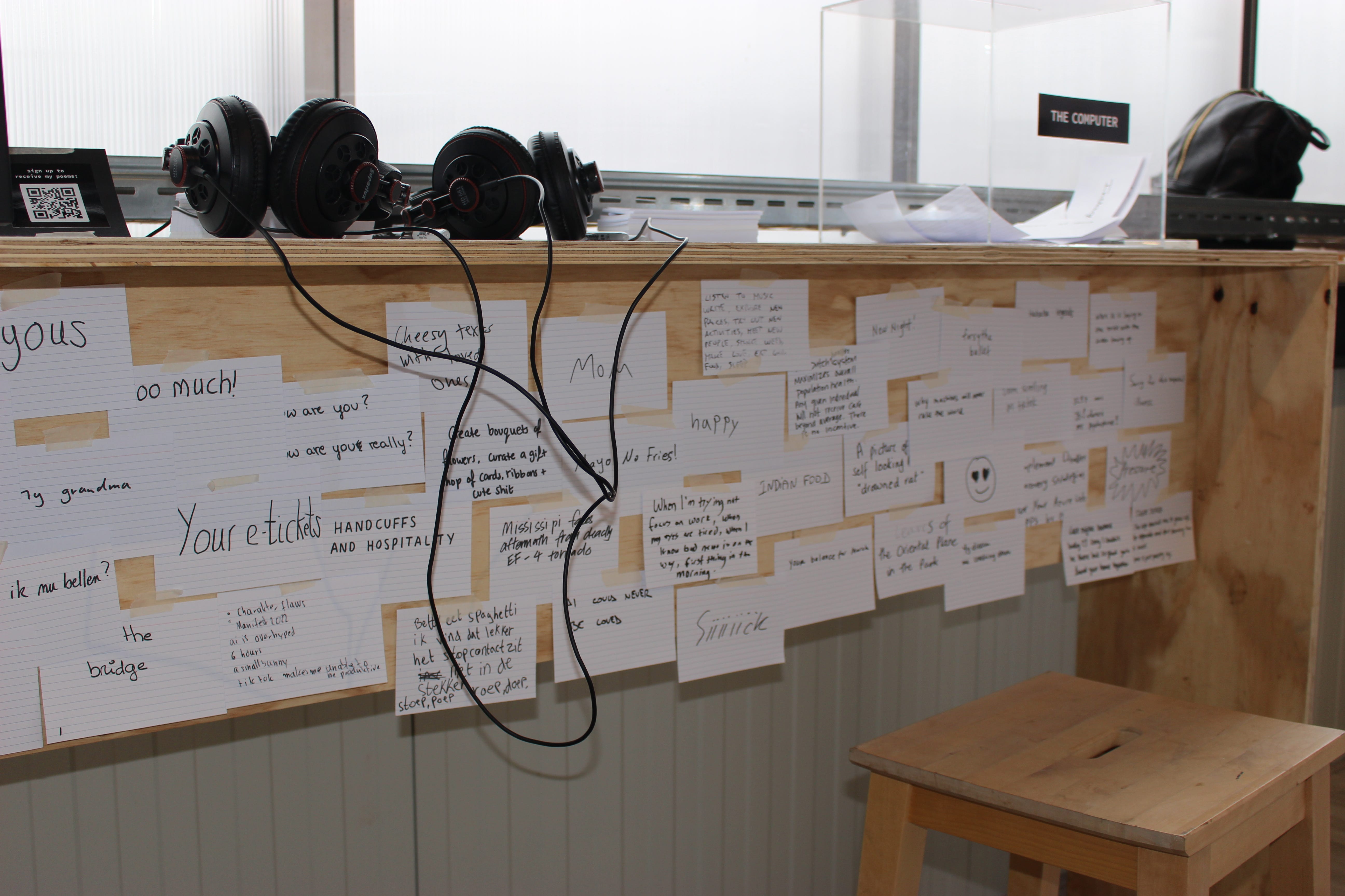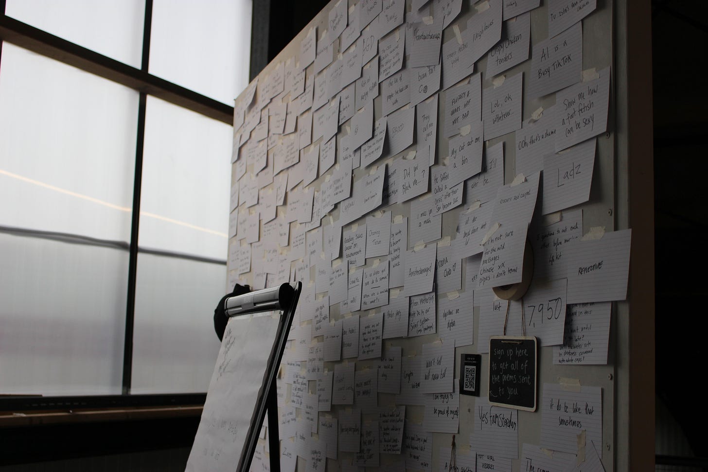 The poet, Kelly Mullins, uses the material generated in the room to write and exhibit their work in real time during the installation. The public is also invited to participate in the generation of poems using the source text. Poems generated from the room will be shared regularly with the public in this email newsletter and on this website.